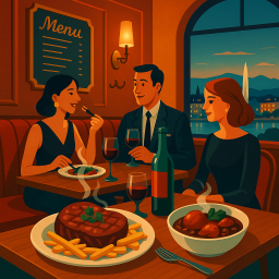 * Peter can now enjoy the dinner with his friends at Bistrot du Bœuf Rouge Genève!