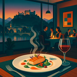 Ikarus is a small 2 Michelin star restaurant at Hanger-7 in Salzburg. Hanger-7 is an exhibition space with Red Bull cars and aeroplanes (great to look round) The restaurant is unique in that it has guest chefs from other world remowned restaurants wh