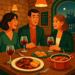 * Peter can now enjoy the dinner with his friends at Restaurant Rustique - Lyon!